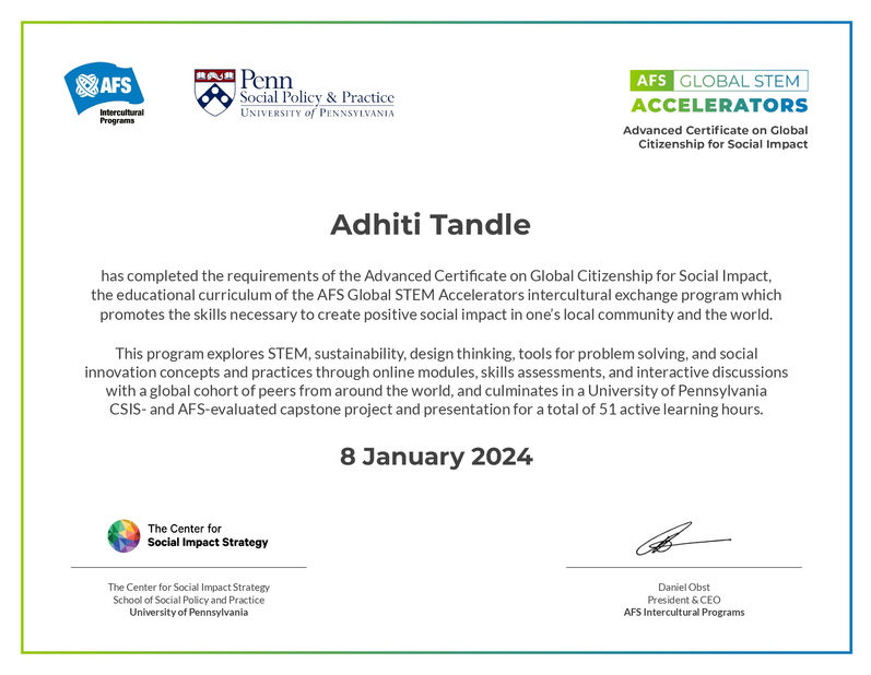 The program culminates with scholars developing social impact capstone projects and presentations that offer potential solutions to real-world challenges, with an emphasis on sustainability. Scholars who complete the program earn the Advanced Certificate on Global Competence for Social Impact, awarded by AFS and the University of Pennsylvania Center for Social Impact Strategy.
